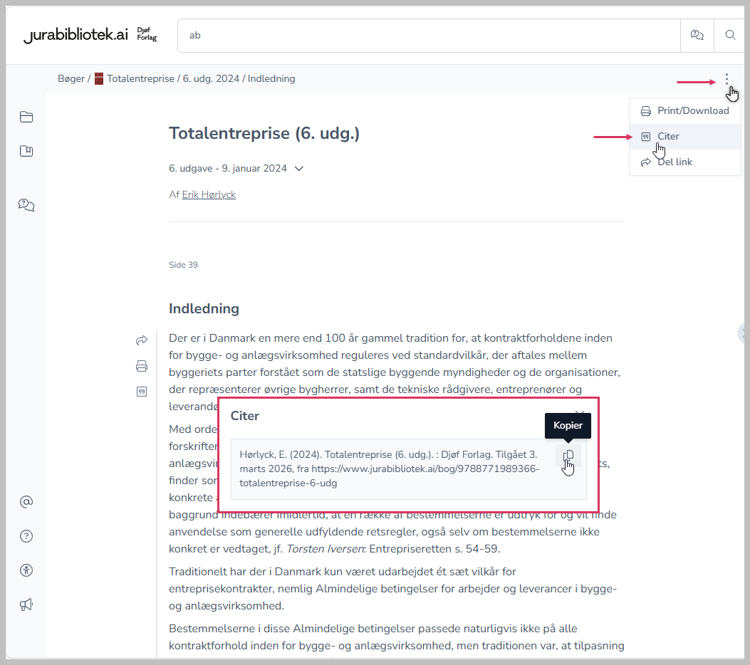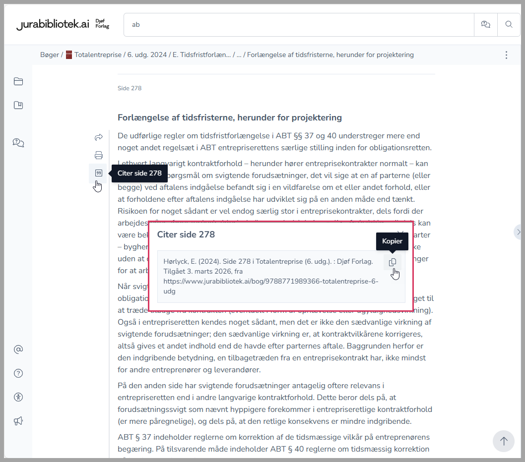 Du kan nemt lave kildehenvisninger til Jurabibliotek - ét enkelt klik og Jurabibliotek danner en kildehenvisning med link og datostempel for dig.