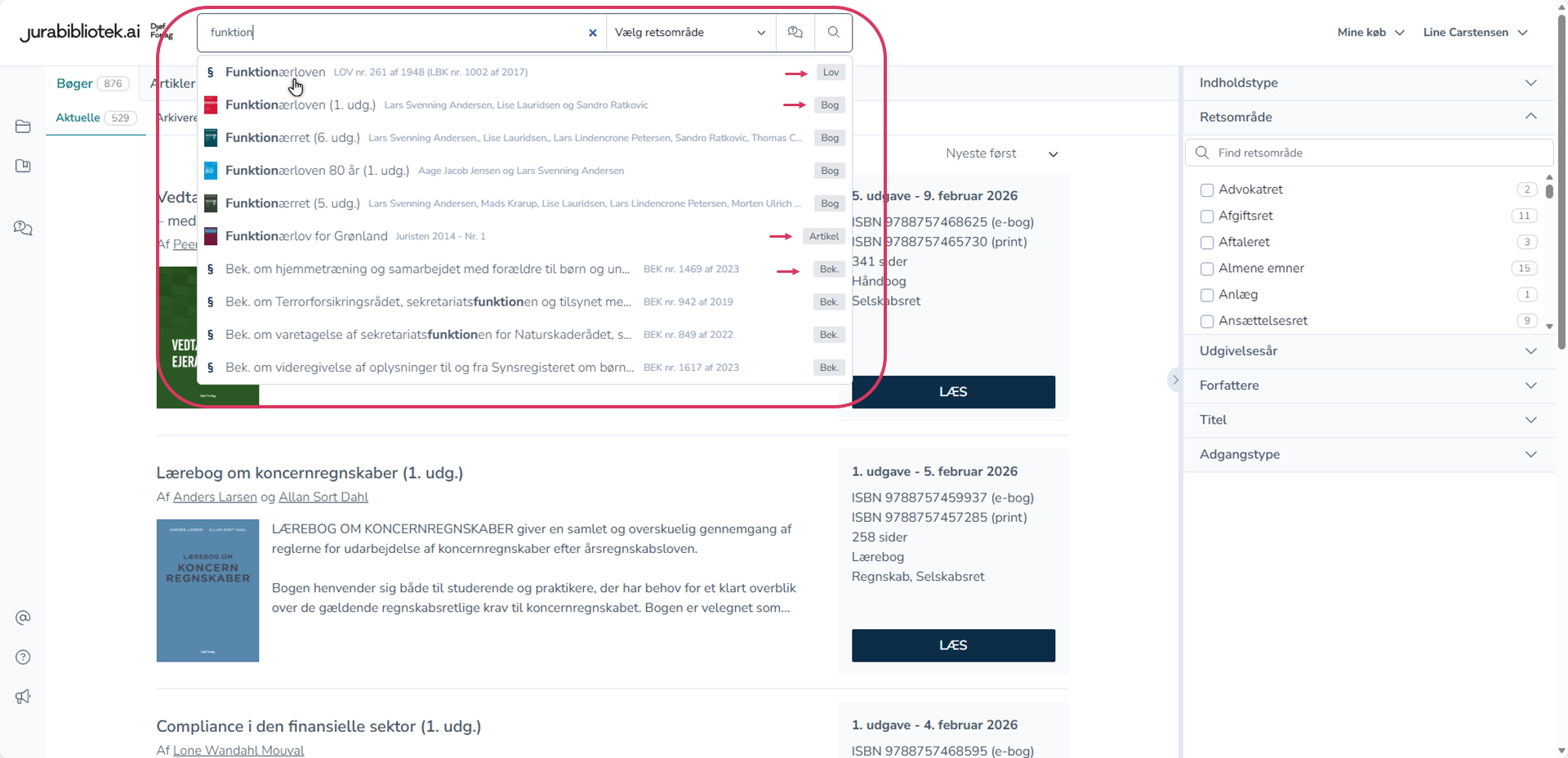 Du har mulighed for at gå direkte til et dokument fra søgeboksen. Når du begynder at skrive, foreslår systemet dokumenter, der matcher din søgning. Er der flere match, får du mulighed for at vælge dokumenttypen, f.eks. lov eller bog. Du kan også komme direkte til en specifik § i en lov eller en lovkommentar eller til en bestemt side i en bog.